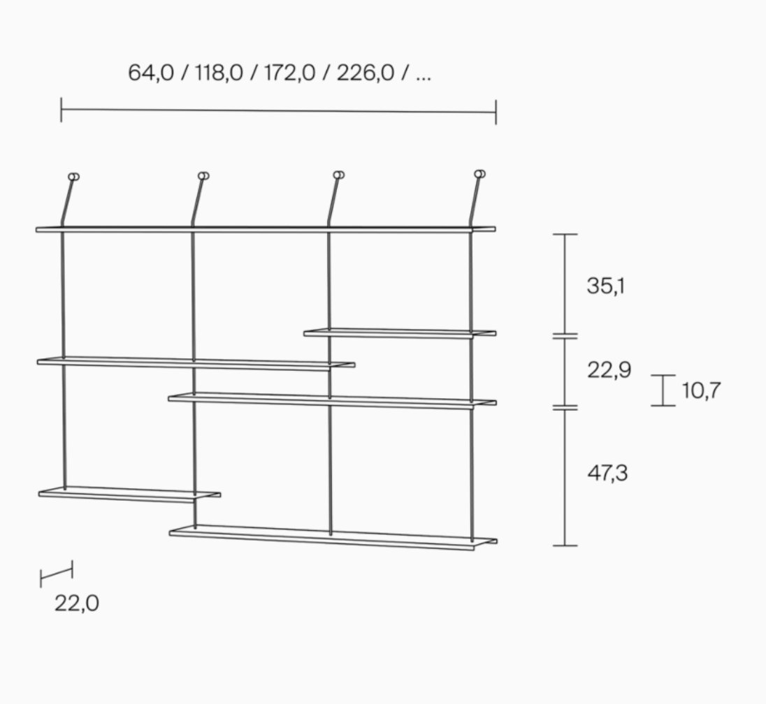 Wat Liesl onderscheidt, is de innovatieve ophangmethode: eenmaal de bovenste plank bevestigd is, kunnen de overige planken eenvoudig worden toegevoegd zonder extra bevestigingen of sporen op de muur. Dit zorgt voor een ‘zwevend’ effect, waarbij de kast licht en elegant oogt.